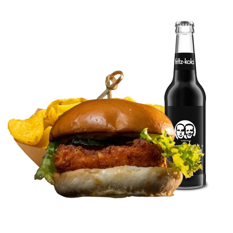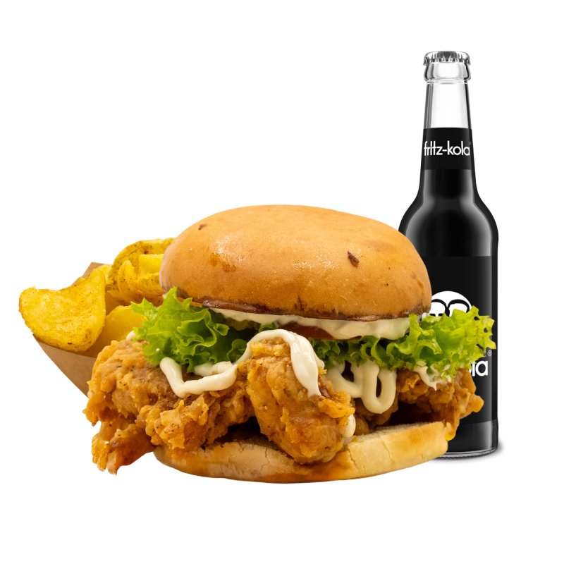Unser SPECIAL Chicken Burger im Menü mit French Fries und Getränk