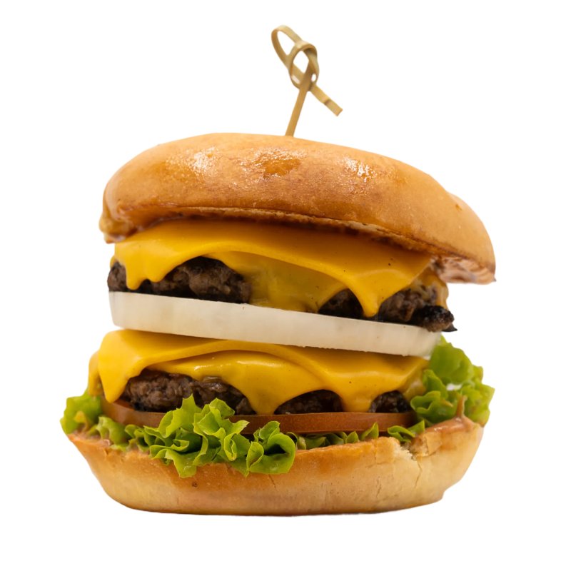 Rindfleisch, Zwiebeln, Tomate, Röstzwiebeln, eigener BBQ-Soße, Cheddar und Essiggurken (Double Patty: 10,60 €)